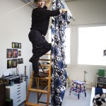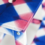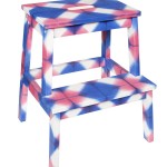 “Jag funderade på olika alternativ ett par dagar men min första tanke var att klä in den i ett av mina tyger. Jag hade tyget sedan tidigare och förstod när jag såg det hur jag skulle göra. Jag klippte till bitar som passade pallens delar och limmade med vävlim. Sedan skruvade jag ihop pallen och lackade med ett vattenbaserat lack ett par gånger. Själva tyget är ett shiborityg med enkel mönstring och i två ganska starka färger, inspirerat av den ryska balettens kostymer. Jag tyckte det passade bra ihop med den enkla formen på pallen.”