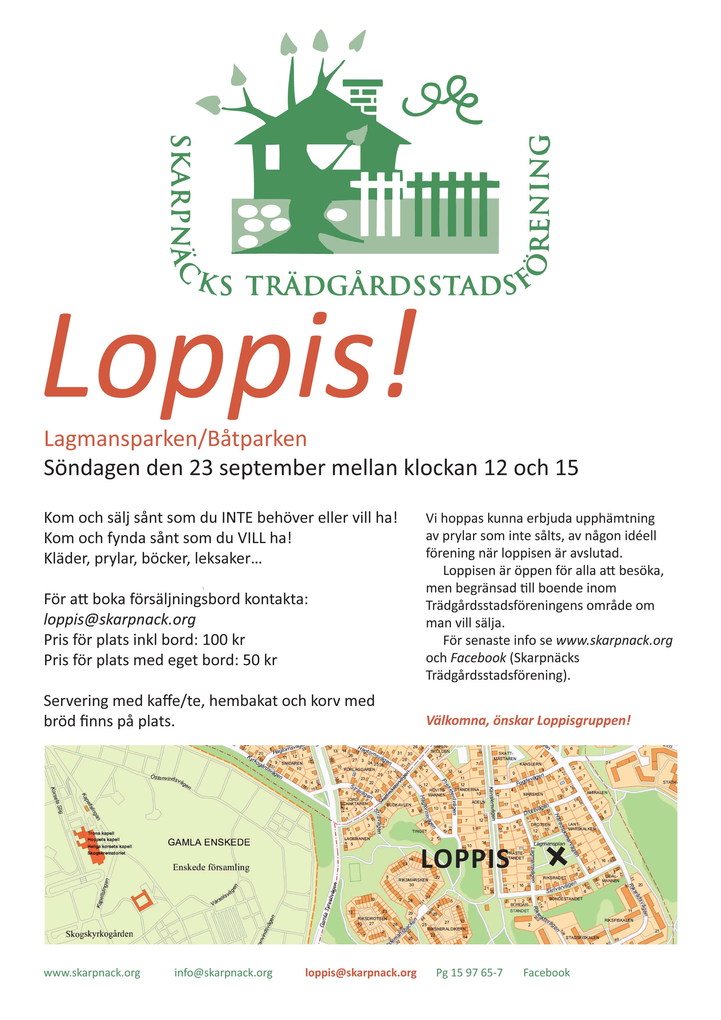 Arrangör är Skarpnäcks Trädgårdsstadsförening och alla som vill är välkomna att komma och handla. Säljer gör de boende i hus tillhörande föreningen. Loppisen äger rum mellan klockan 12-15. Mer info hittar ni i annonsen nedan eller på deras hemsida (www.skarpnack.org).